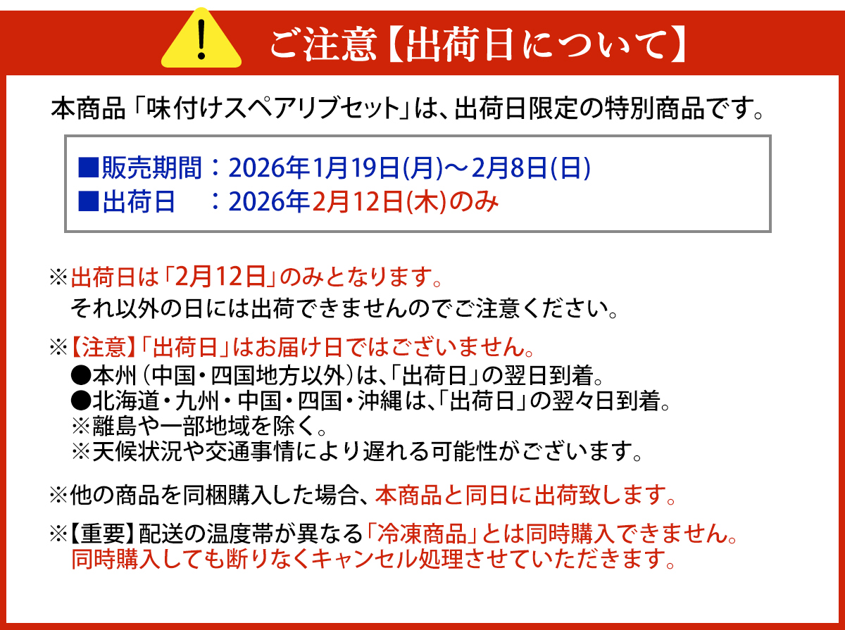 ※他の商品を同梱購入した場合、「味付けスペアリブセット」と同時の「2月12日」に出荷致します。