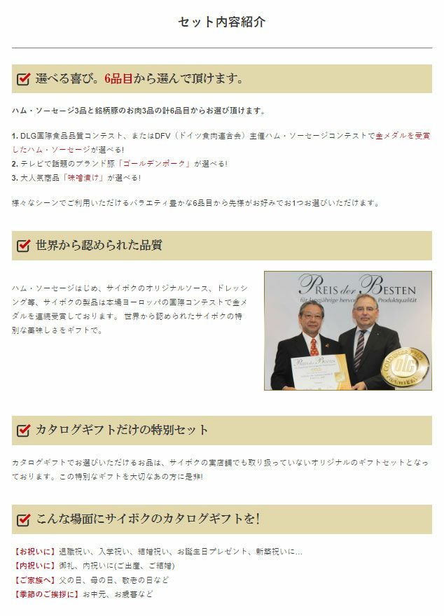 カタログギフトは、贈り先様にお好きなものを選んで頂けるのが魅力で満足度の高いギフトです。選りすぐりのハム・ウインナー・ソーセージ・豚肉などバラエティ豊かな全6品目を取り揃えました。お中元・お歳暮・お祝い・お返しなど幅広いシーンでご利用いただけます。保存料を一切使用せずお肉の自然の味を大切にした世界が認めるおいしさを贈り先様にお楽しみいただけます。