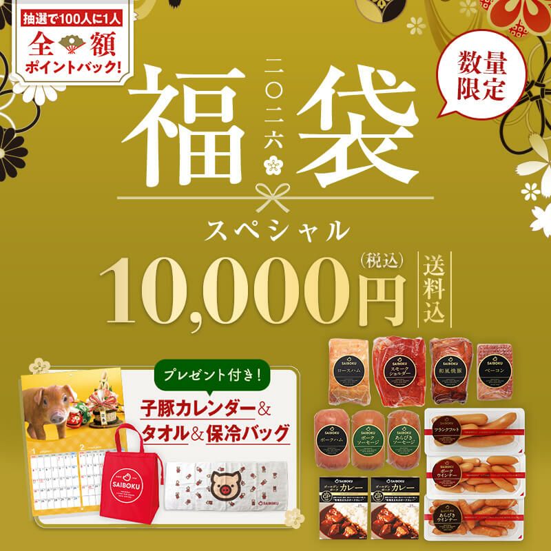 | ■対象条件 ・サイボク公式オンラインショップに会員登録し、ログインしてのご購入。 ・「2026福袋」4商品(スタンダード、スペシャル、プレミアム、冷凍グルメ)からいずれかをご購入。 ■当選発表 福袋販売期間終了日(2026年1月3日 8時30分)以降、1月10日までに 当選者を決定いたします。 ご注文いただいた際の会員登録に対するポイントの付与をもって、当選の発表に代えさせていただきます。 ポイントはマイページの「ポイント履歴」からご確認いただけます。 ※会員登録をせずにご購入いただいた場合、事後にポイント付与をすることは致しかねますのでご注意ください。 |
