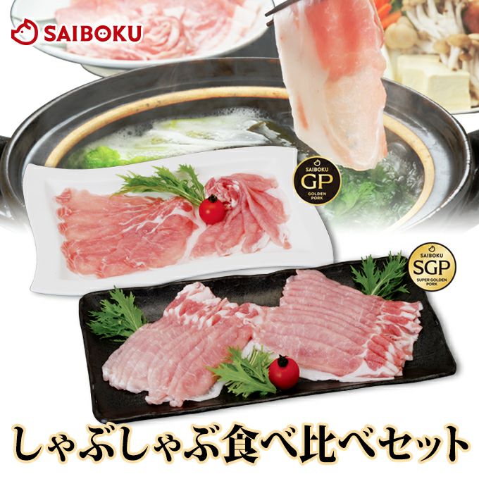 サイボク ブランド豚「スーパーゴールデンポーク(SGP)」と「ゴールデンポーク(GP)」のロースの部位を、しゃぶしゃぶで食べ比べができる人気のセットです。