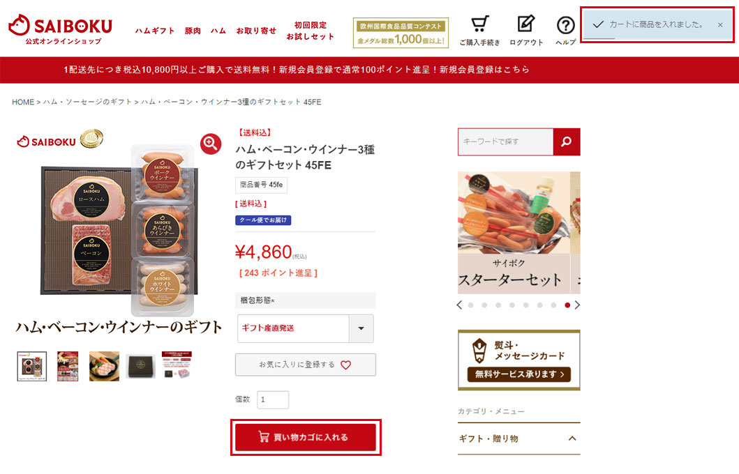 ボタンを押すと、画面上部に「カートに商品を入れました。」とメッセージが表示されます。