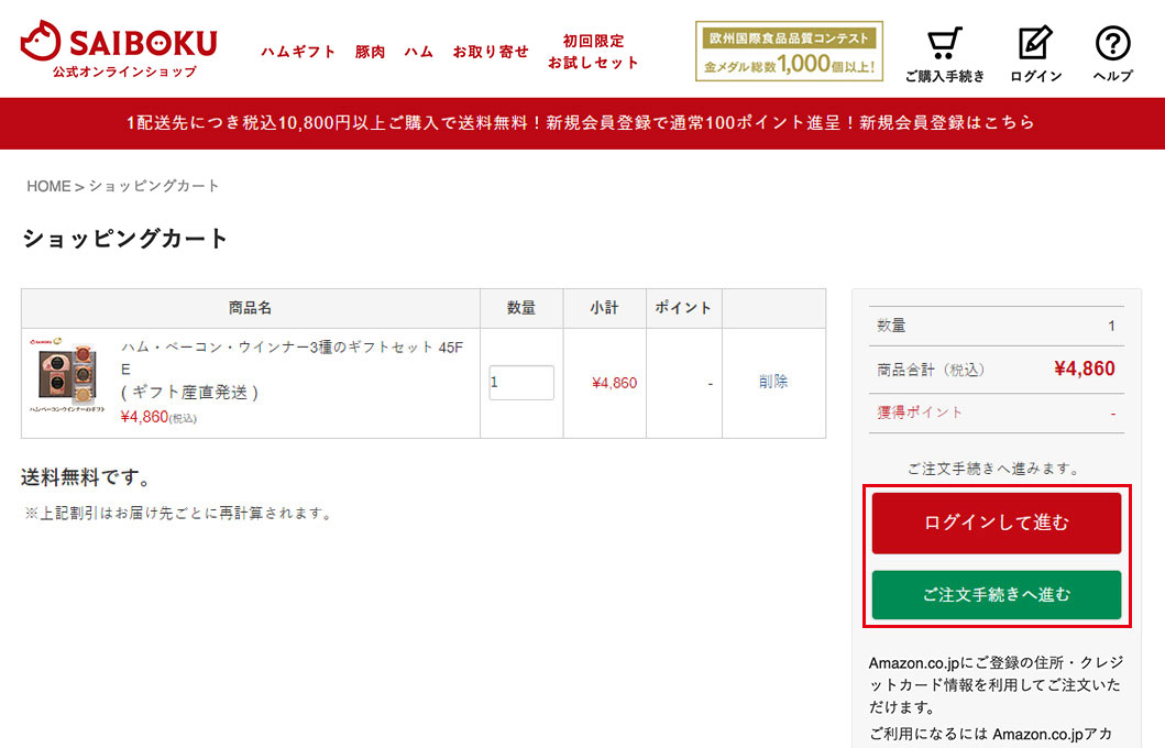 ログインをしていない場合、【ログインして進む】ボタンをクリックすることで、ログインフォームへ移動しログインすることが可能です。