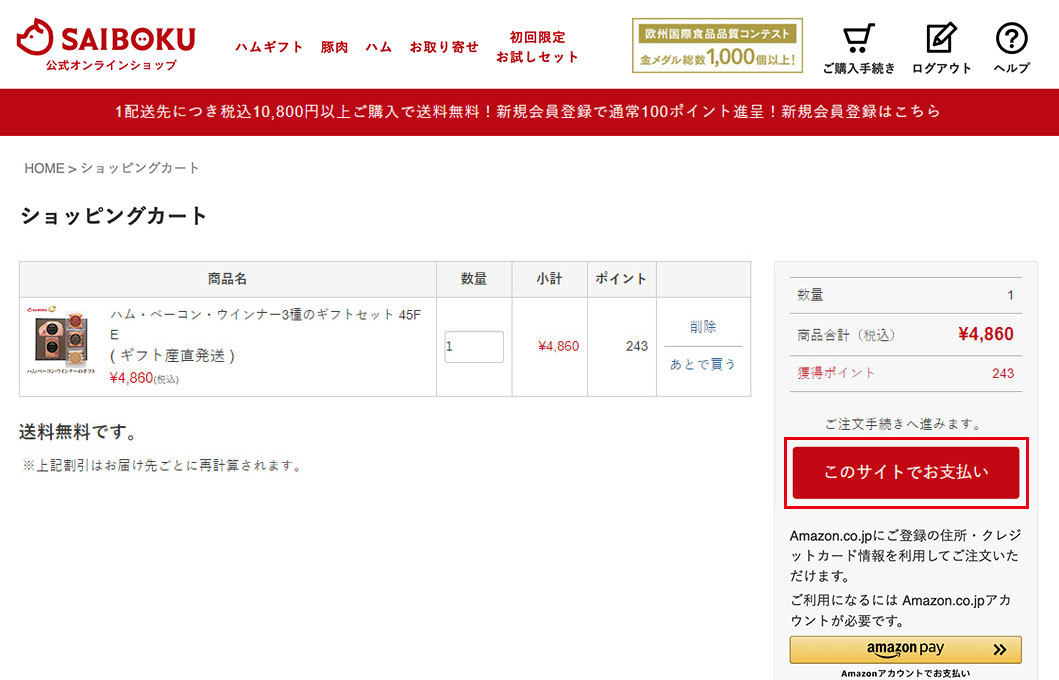 カートの内容を確認し、お間違えが無い場合は【このサイトでお支払い】ボタンをクリックします。